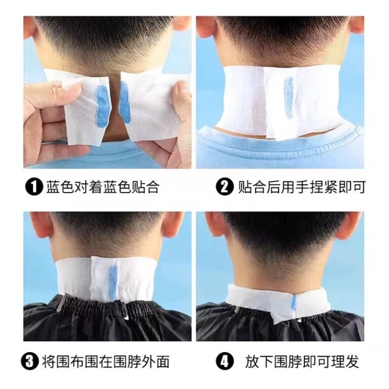 يتم لف الشريط حول الرقبة قبل ارتداء عباءة الحلاقة، ويُثبت بلطف لراحة وثبات مثالي - ملاحظات إضافية: