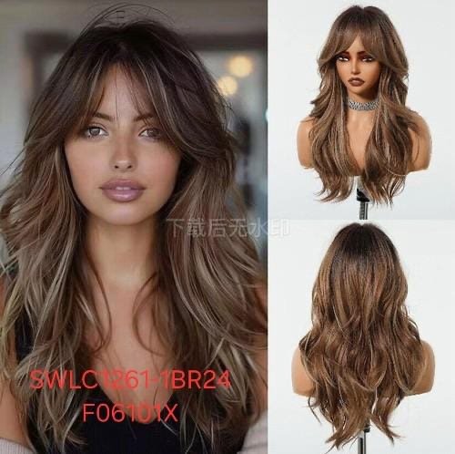 شعر مستعار صناعي مقاوم للحرارة، شعر طويل مموج، لون بني كستنائي، موديل SWLC1261-1BR24-F06101X
