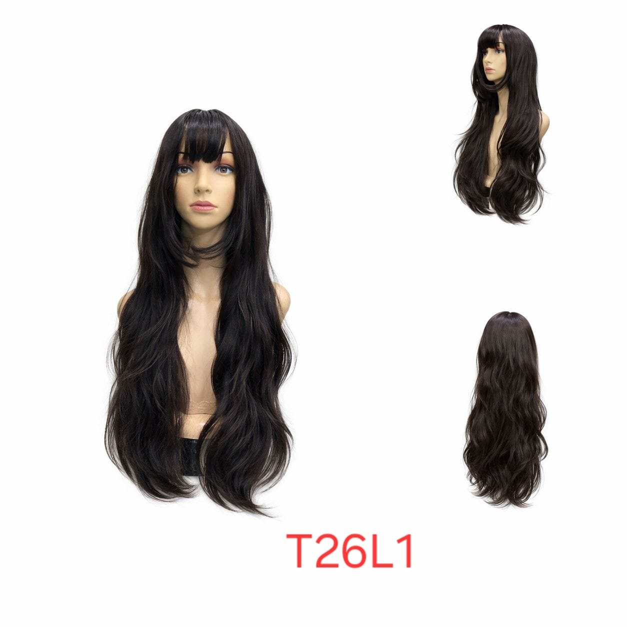 شعر مستعار صناعي مقاوم للحرارة، شعر طويل مموج مع غرة، لون داكن، موديل T26L1