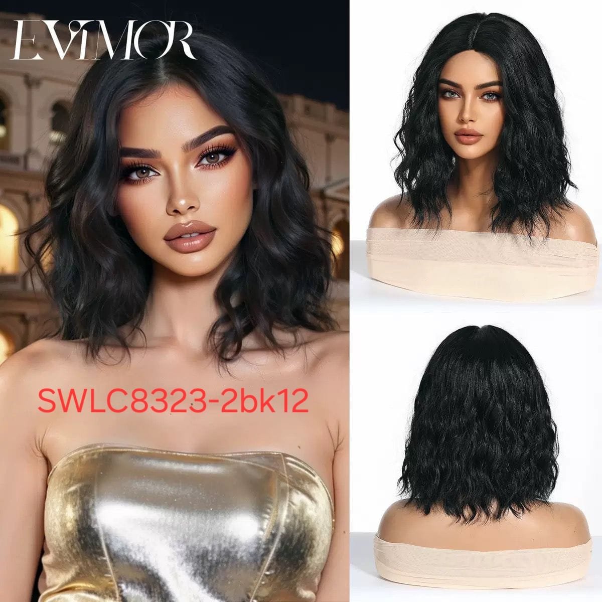 شعر مستعار صناعي مقاوم للحرارة، شعر قصير مموج، لون أسود طبيعي، موديل SWLC8323-2bk12