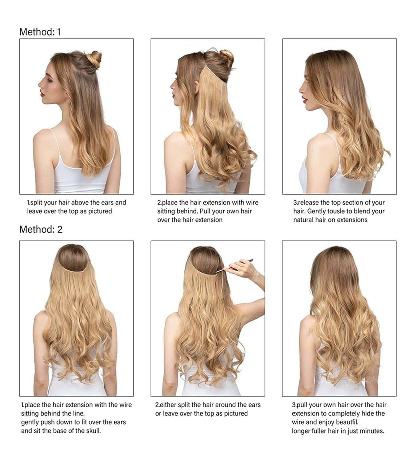 • توفير الوقت: استغني عن ساعات العمل الطويلة في صالونات التجميل مع وصلات الشعر الهالة المريحة هذه. احصلي على التسريحة التي ترغبين بها في دقائق معدودة.
