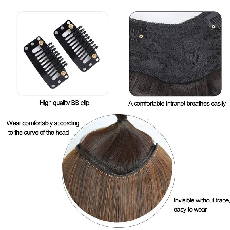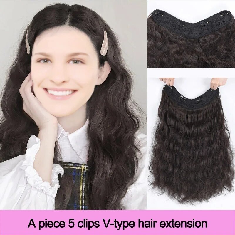 وصلات شعر صناعية مموجة، طولها 16 بوصة، لونها أسود وبني، على شكل حرف V، قطعة واحدة، بنمط مموج طبيعي